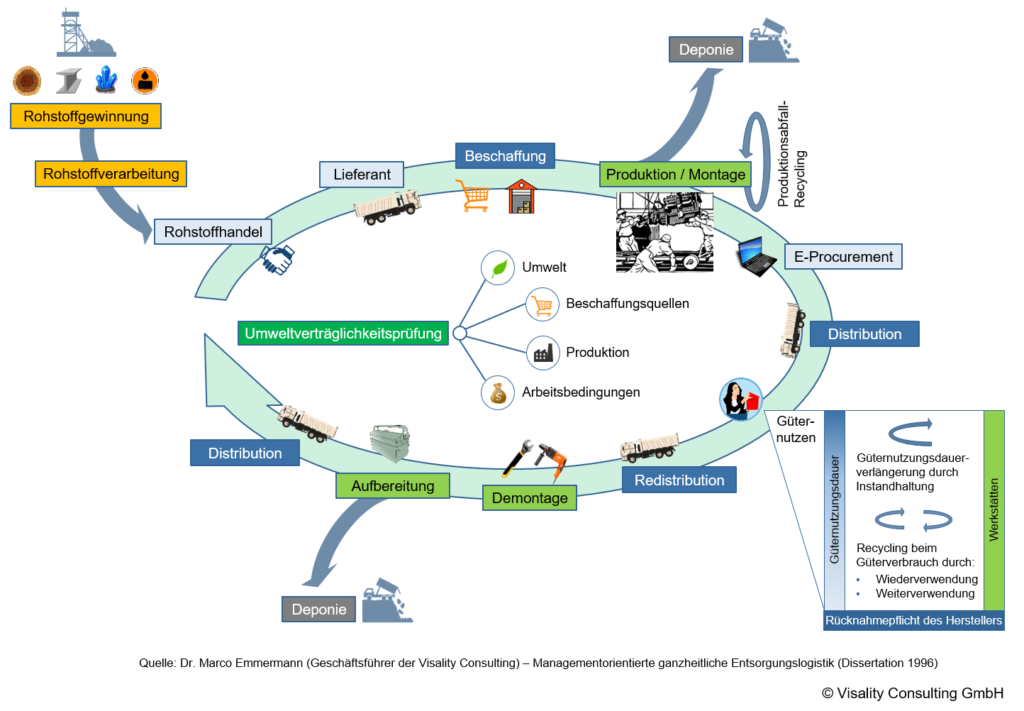 - Nachhaltigkeitsmanagement mit Strategien und Konzepten zu Greening the supply chain, Optimierung der Entsorgungslogistik, Reduzierung des Ressourcenverbrauchs (z.B. Verpackungsmaterialien) sowie Messung und Optimierung des CO2-Footprints entlang der gesamten Wertschöpfungskette (inkl. der Lieferanten und Dienstleister; vgl. nachfolgende Abbildung)