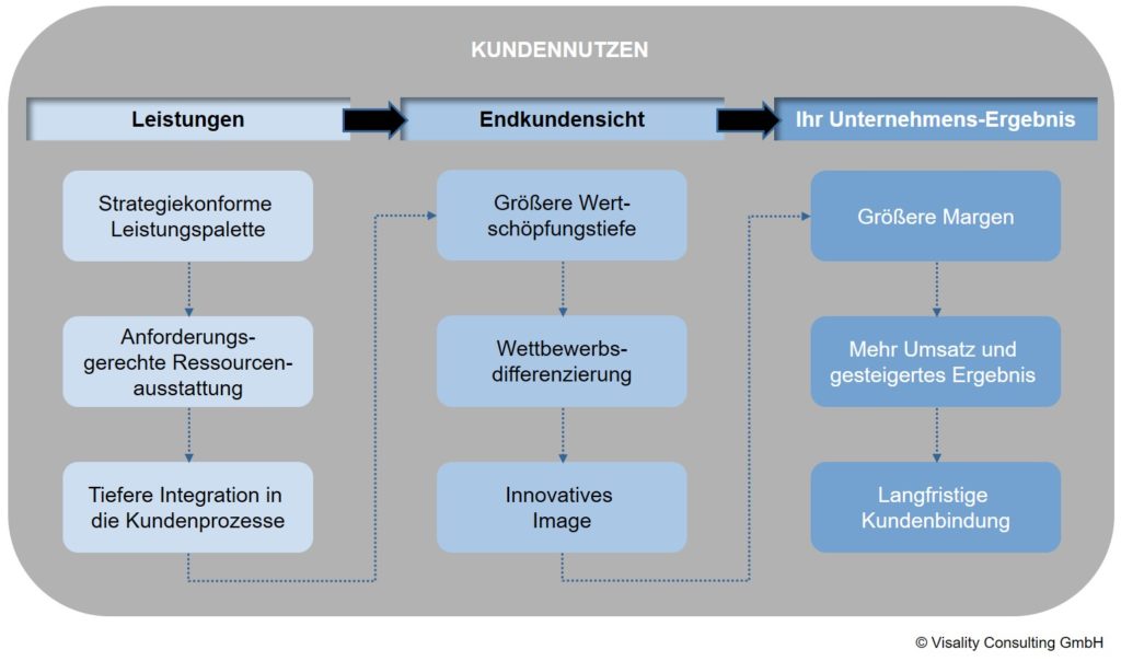 Und da wir als Beratung gern den Beweis antreten, erarbeiten wir auf Wunsch auch gleich den Business-Plan, die passenden Ansprache-Unterlagen, unterstützen die Suche nach Pilotkunden und führen gemeinsam mit Ihnen die initialen Akquise-Gespräche. So wird der Vertrieb nicht nur angestoßen, sondern geschult auf ein nutzenorientiertes Consultative Selling. Und der entstehende Nutzen beginnt in Ihrem Unternehmen, wird von Ihren Kunden wahrgenommen und fließt zu Ihnen zurück (vgl. Abb 2).