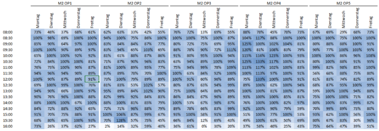 Wesentlicher Bestandteil des internen Benchmarks sind Auswertungen zur Mustererkennung von Auslastungsverläufen im Tagesverlauf. Gute Auswertungen lassen ins Auge springen, was häufig nicht funktioniert. Die folgende Auswertung zeigt z.B. auf einen Blick, dass in Saal 3 und in Saal 5 mittwochs später begonnen wird und Saal 3 am Mittwochnachmittag schlechter ausgelastet ist als an anderen Wochentagen.
